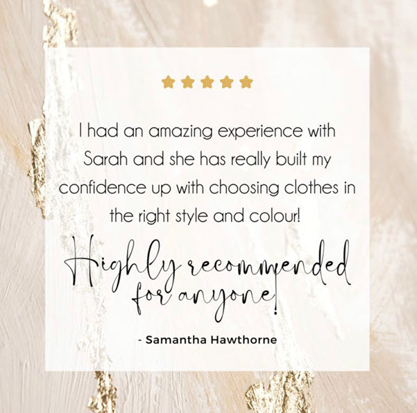 Sarah’s enthusiasm and honest feedback are fantastic. Her passion for helping you look and feel great are infectious and you can’t but leave feeling amazing afterwards.